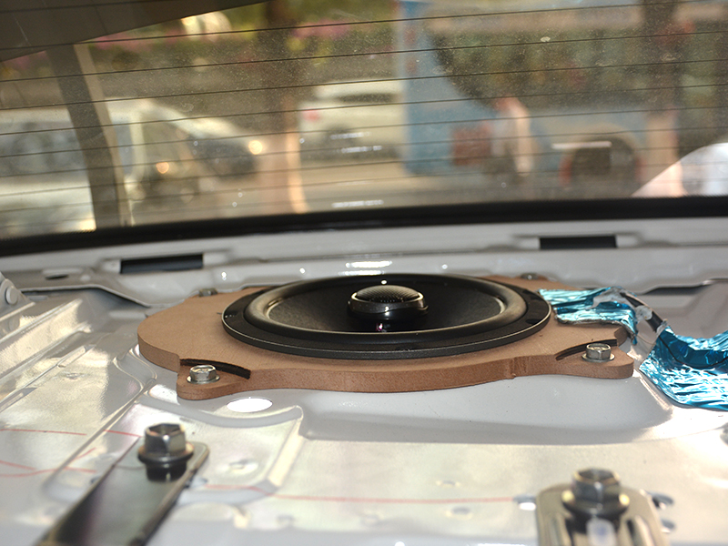 卡羅拉后門沒有喇叭,原車喇叭是在后窗下,本身是6x9寸的,我們做了一個專用墊圈改裝成6.5寸的同軸,