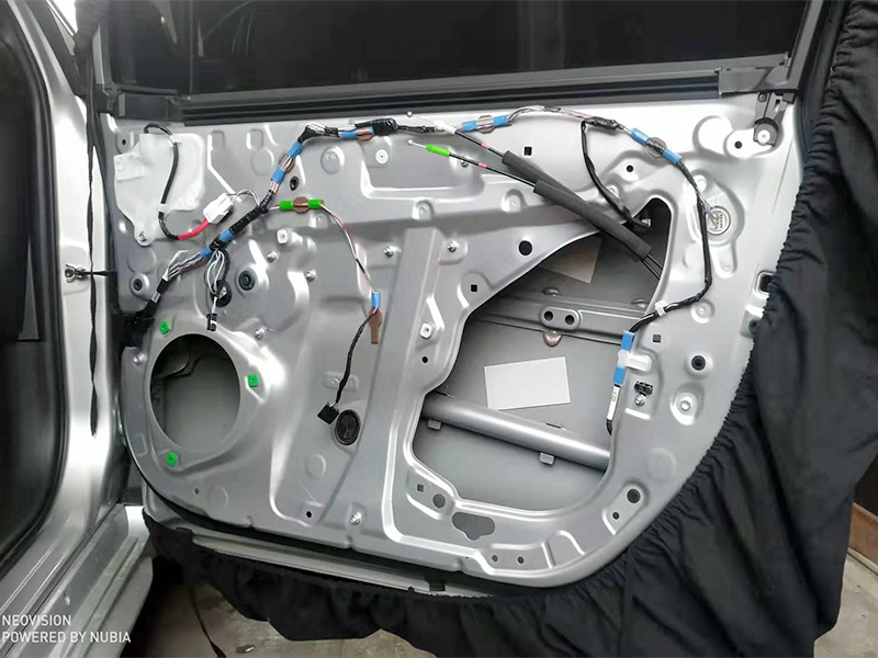 拆開門板,原車前后門板只有單薄的塑料防水層,起不到隔音的作用,而且容易產(chǎn)生異響