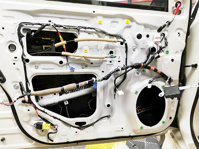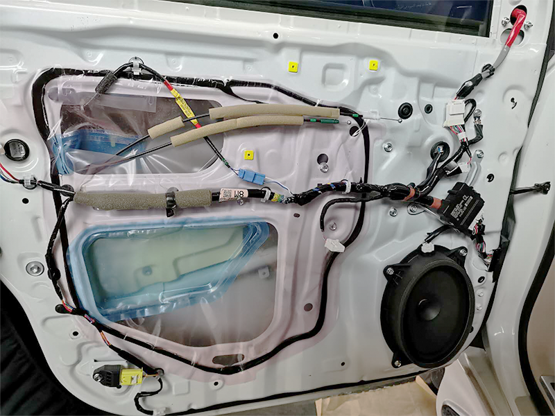 這是霸道拆卸門板后,原車的內(nèi)部結構。只有一層薄薄的防水膠膜。很容易產(chǎn)生共振產(chǎn)生異響