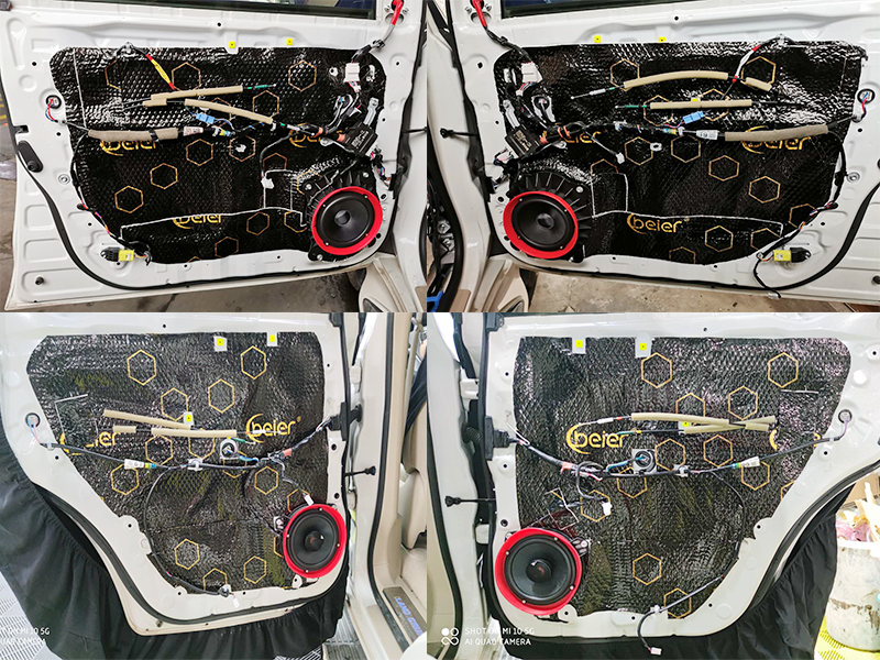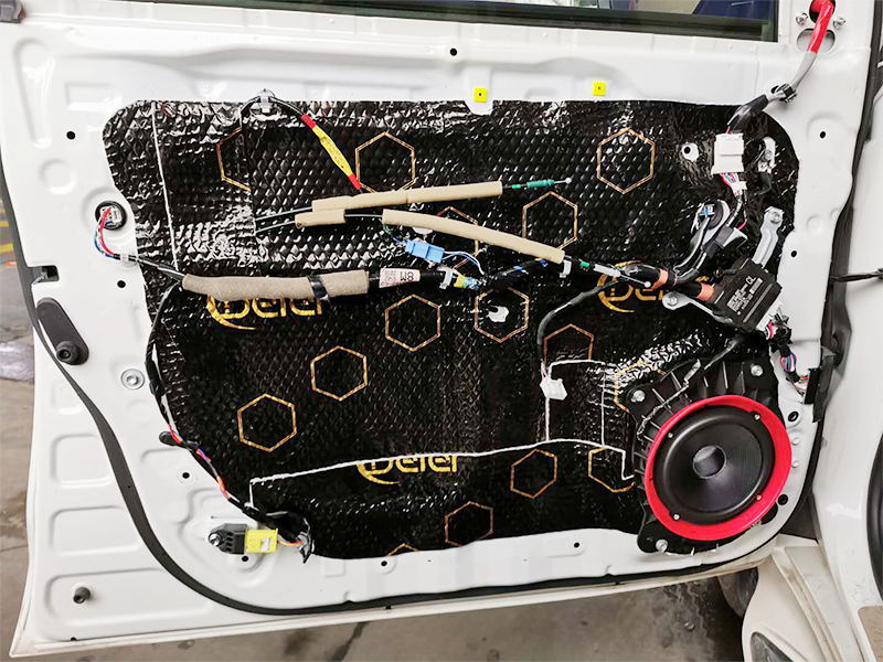 使用貝爾的止震板對原車門板的鈑金進行加強厚度減少共振點,防止異響提升音響效果