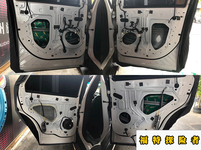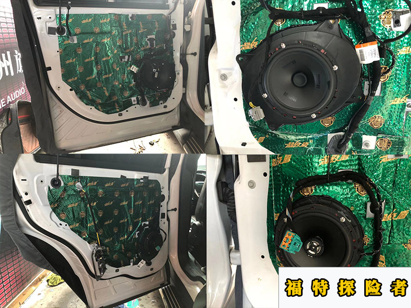 這臺福特探險者是老客戶了,之前改的一臺M8也是這位車主的,這邊先就簡單看一下配置,四門6個喇叭都是曼斯特的,前聲場的中置喇叭是JBL的,另外后尾箱還更換了一個JBL的8寸低音炮。加裝的東西有圣美歌的低音功放一個,阿爾派的R600處理器一個。四門的大能隔音