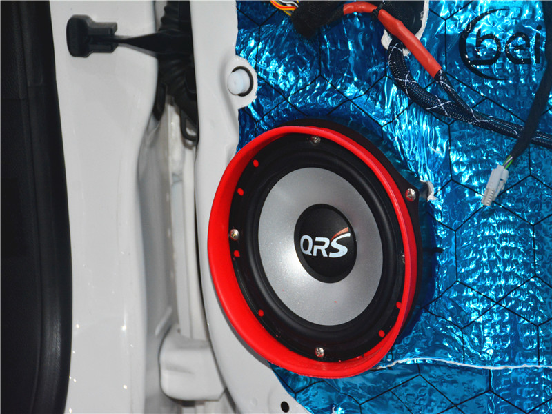 要想得到好的人聲和低音,門板需要做隔音處理,做成類似箱體的形狀不但聲音得到改善門板厚實(shí)改善了鈑金疲勞,共振、隔音、降噪。原裝進(jìn)口意大利QRS AS-165二分頻套裝前門中低音的安裝效果圖,防水罩用的是德樂自主研發(fā)設(shè)計(jì)專利產(chǎn)品,喇叭罩特點(diǎn)是防水和密封突出部分與塑料內(nèi)飾門板相結(jié)合能使聲波直接從門板穿透到室內(nèi)使聲音更加清晰。