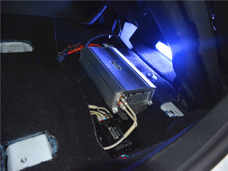 圣美歌HTL-8高轉(zhuǎn)低和中國圣美歌PK700.4 四路功放都安裝在座椅下方不但散熱好并且隱蔽