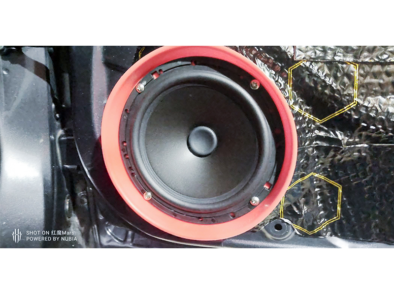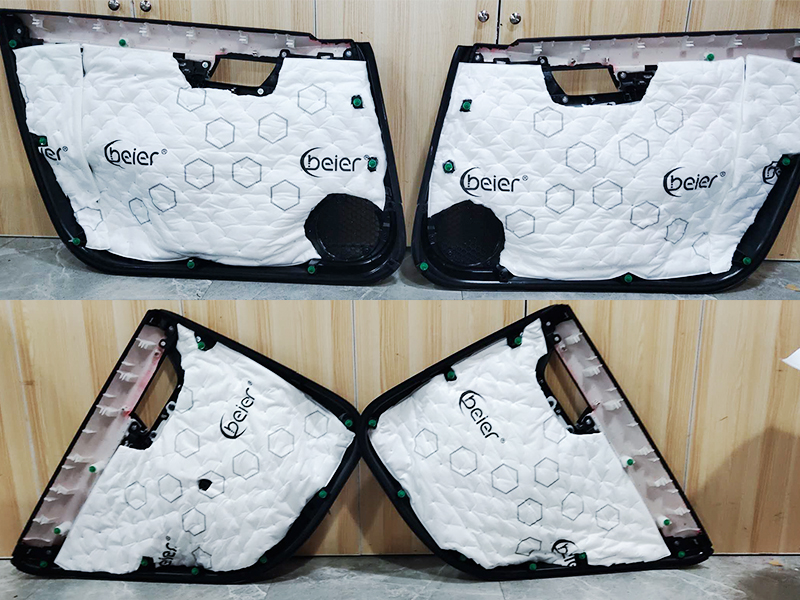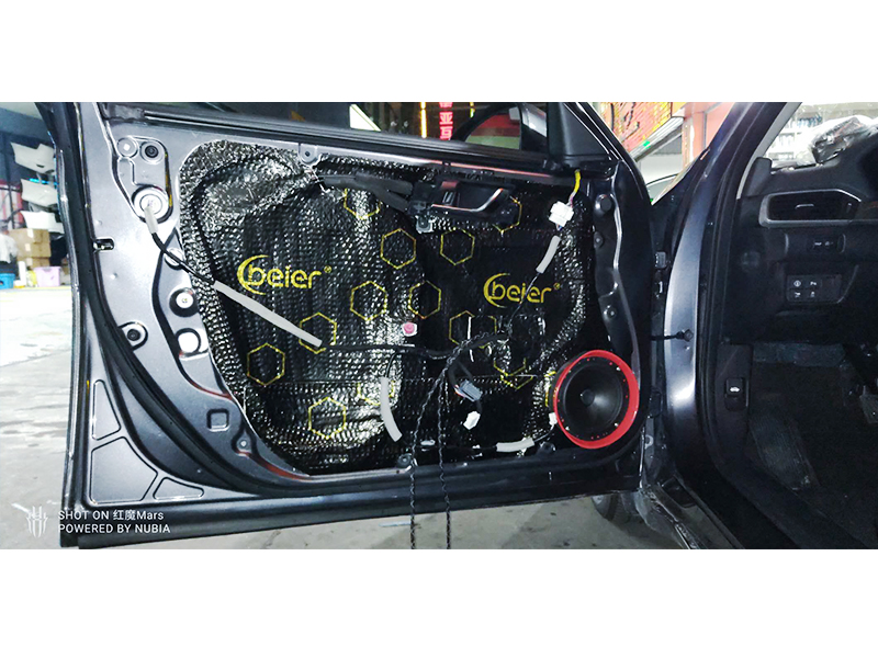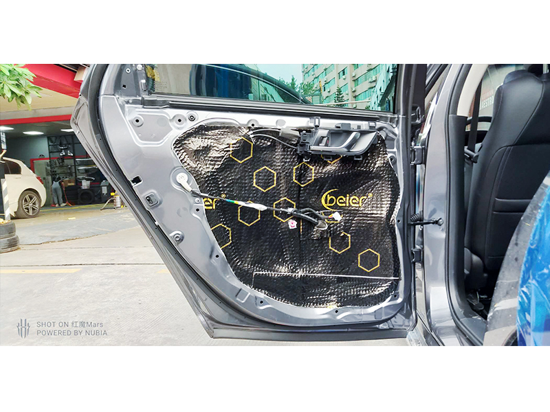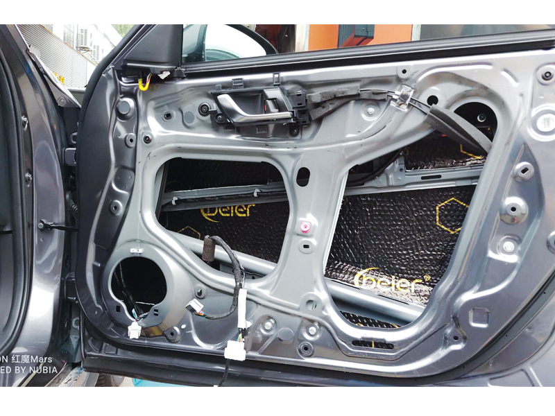 首先我們的第一步依舊是先做全車隔音。畢竟原車的車身門(mén)板比較薄,隔音效果是非常差的。聲音也容易產(chǎn)生共振,影響音質(zhì)。這里我們使用貝爾黑金剛隔音膜在內(nèi)壁加厚。減少共振和增強(qiáng)隔音效果