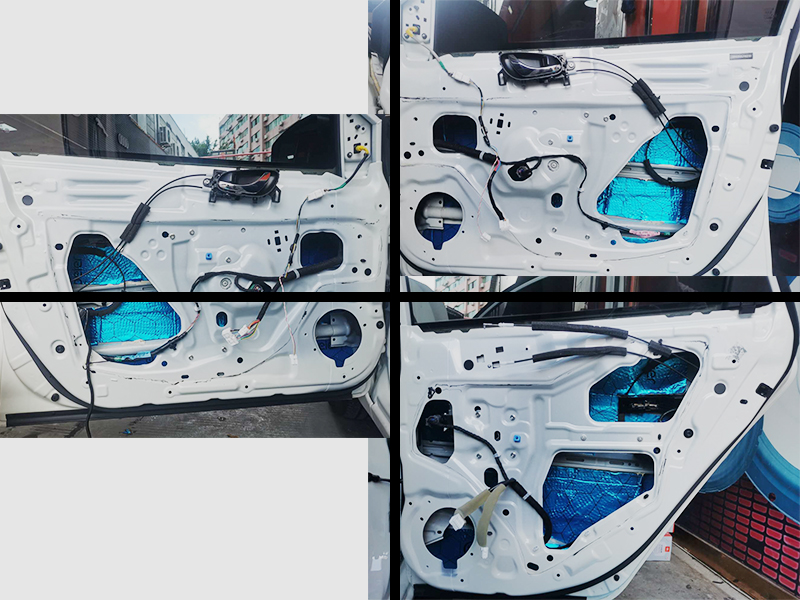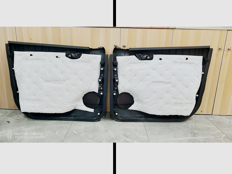 音響的改裝都離不開隔音,所以我們的第一層也是給四個(gè)車門隔音,這里使用的是貝爾的隔音藍(lán)膜。加厚車門的厚度能很好的減少聲音傳播的時(shí)候產(chǎn)生共振。