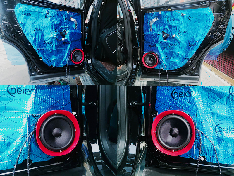 第二步是拆掉原車的喇叭安裝新的。再使用貝爾的隔音藍(lán)膜制造密封層。密封能使聲音的回響做到最少的丟失。隔音效果也更好。