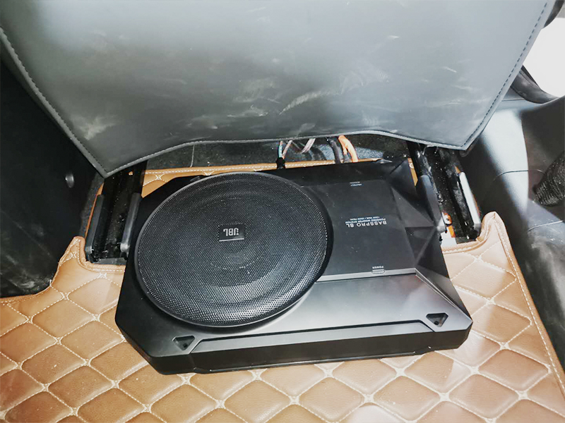車主還選用了一個超薄的JBL低音炮。這款低音炮相對來說體積更小,適合空間較小的車。當(dāng)然我們也有更大的低音炮。只要能的車空間夠大。(一般放在后備箱)這個低音炮是隱藏在座椅底下的。