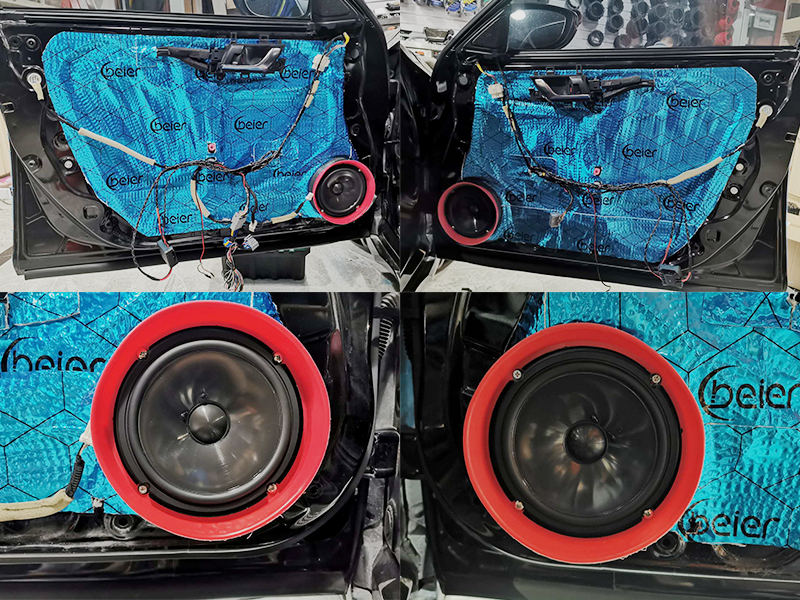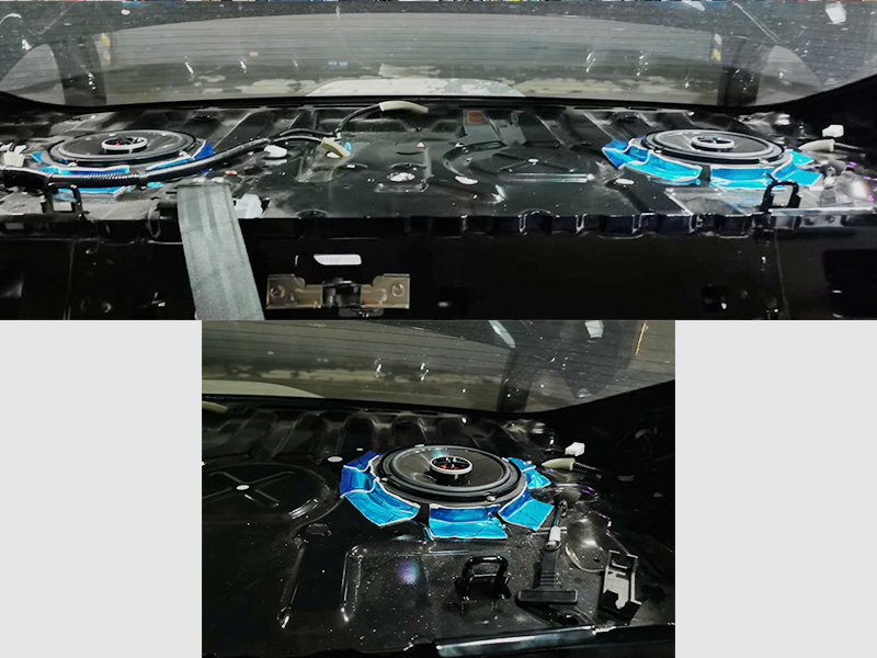 首先我們先做的一定是做隔音!畢竟做音響升級,隔音不好的話也是白搭的。大部分原車的隔音和回響都很一般。這里我們用貝爾的隔音藍膜來做隔音。黏貼式操作,一點不傷車。您也可以看到我們也為您的愛車的車身做了保護,防止施工過程中發(fā)生剮蹭。