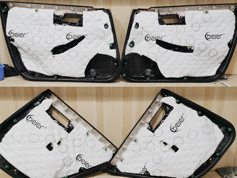 第三步是要給車門做好降噪,就是做吸音層。用到的是比較后的吸音棉。比較厚實,吸音降噪效果杠杠的。也能很好的減少共振