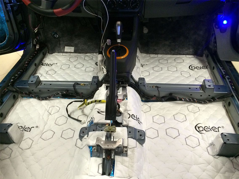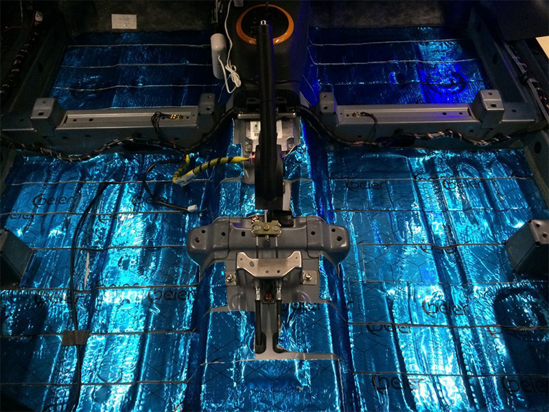 底盤隔音。底盤面積比較大,施工內(nèi)容也比較大點,先將底盤清理干凈,再貼上一層榮茂減震板。底盤低音能夠抑制底盤部位的隔音,特別是車輛在行駛在顛簸路段的時候,噪音能夠有效地得到抑制。