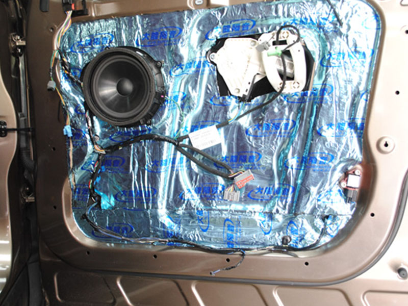 車門內(nèi)層隔音,是師傅從小孔伸進去仔細(xì)貼好的,上圖可是貼得很滿,很整潔。不得不說的是,路虎自身門鈑金還挺厚的,不過,車門的隔音,對音響改裝而言,可是大有用途哦