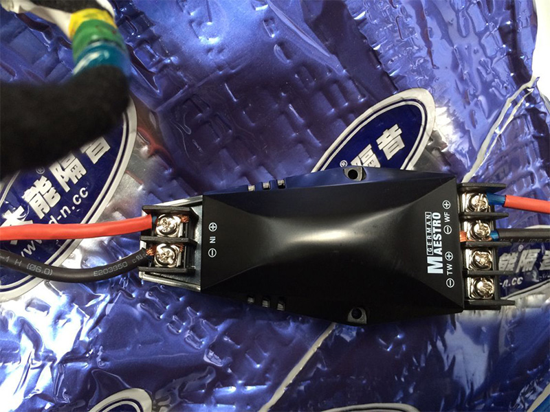 這個(gè)黑色的盒子是喇叭的分頻器單元,它的作用就是將高低音分離出來(lái),高音表現(xiàn)高音,低音表現(xiàn)低音,輸送給相對(duì)應(yīng)的喇叭單元。規(guī)整的分音器線束連接給人清爽舒服的感受