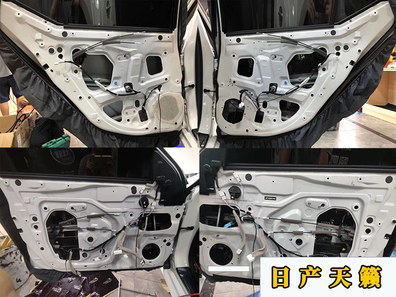 簡單看一下配置,這臺天籟一共是8個(gè)喇叭,前門用的是JBL的套裝喇叭,后門和后平臺用的都是同軸喇叭。加裝的有一臺超薄低音炮,一臺JBL的功放一臺460處理器。另外還有門板的三層隔音
