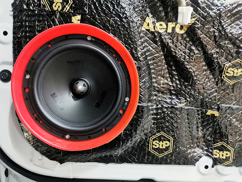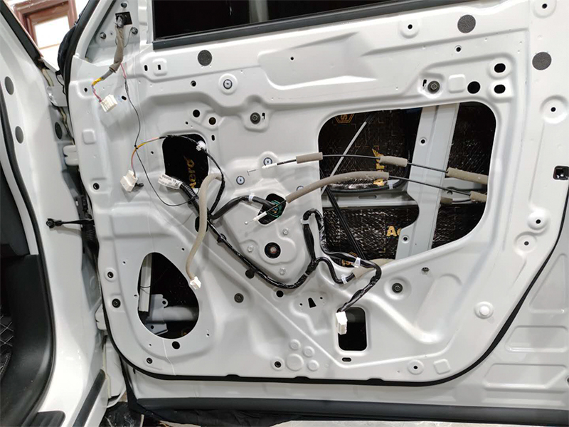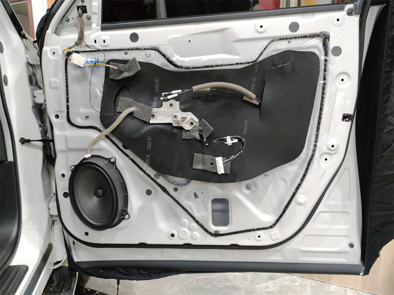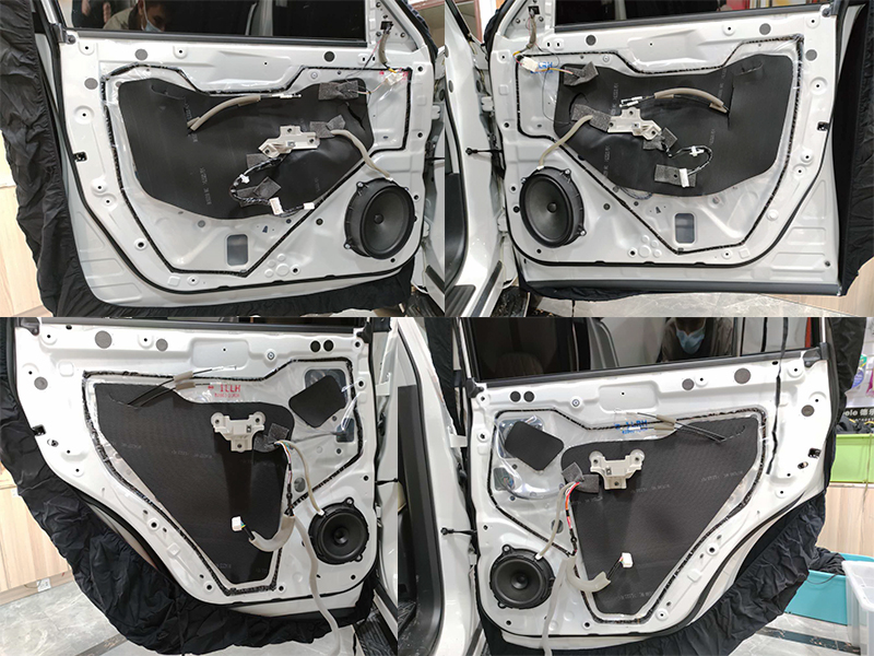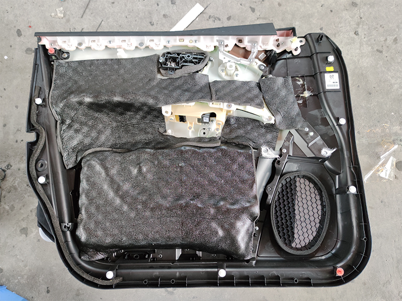 把原車的板門雜物處理掉,經(jīng)過專業(yè)的隔音師傅對第一層鈑金進行STP隔音強化鈑金處理后,屬于第一步降低鈑金共振