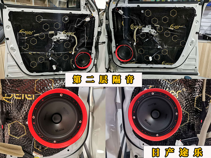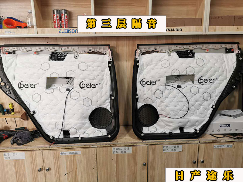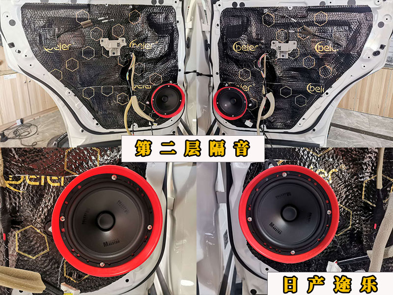 四門三層隔音,就是說門板上是貼了三層隔音的一二層都是止震板,第三層是比較厚實的吸音棉,前者主管增加門板厚度,減少共振,形成密封。后者減少聲噪,改善車內(nèi)環(huán)境。這里還有的就是四門喇叭的安裝,前門兩個中低音,后門兩個中低音外加兩個高音單元。選裝的是曼斯特的喇叭,人聲比較清脆,,安裝上都是專車專用的配件,原車原位安裝。極力打造零損耗的升級體驗,