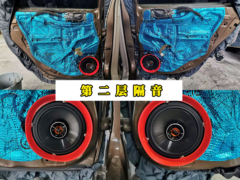 上圖展示的就是第二層隔音貼完之后喇叭的安裝完成圖,第二層的隔音材料和第一層是一樣的,不過就是說第二層是為第一層服務(wù)的,主要就是形成箱體,這樣您的四門車門就如同四個移動的音箱一般,喇叭的安裝上,都是專用的配件,完全不用擔心回過度損耗您的車,畢竟無損升級可不是說著玩的對吧