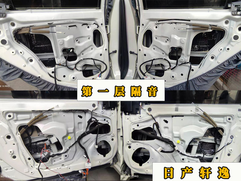 接下來是第二第三層隔音,第二層是密封車門的作用,確保門板不漏音,軒逸的后門是有一個中音喇叭的,在門皮上面,而四個中低音分別在前門和后平臺。安裝效果如上圖所示。都是更換專車專用的喇叭墊,焊線上螺絲就可以了。