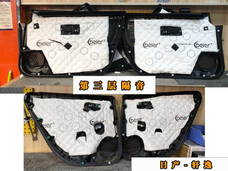 這邊是第一層隔音,主要是增加門板厚度減少共振。右邊是原車的門板狀態(tài),可以看到軒逸的后門是沒(méi)有喇叭的,但為了整車的效果還是得把隔音給做了。