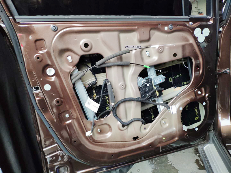 拆卸門板后,就很清晰可以看機(jī)原車并沒有隔音,只是靠一張薄薄的防水膜。防止門板下雨天漏水而已
