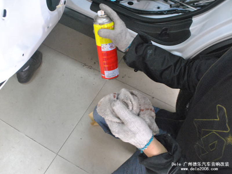 隔音前,需要把作業(yè)表面清理干凈,師傅正在處理車門板的污垢和灰塵