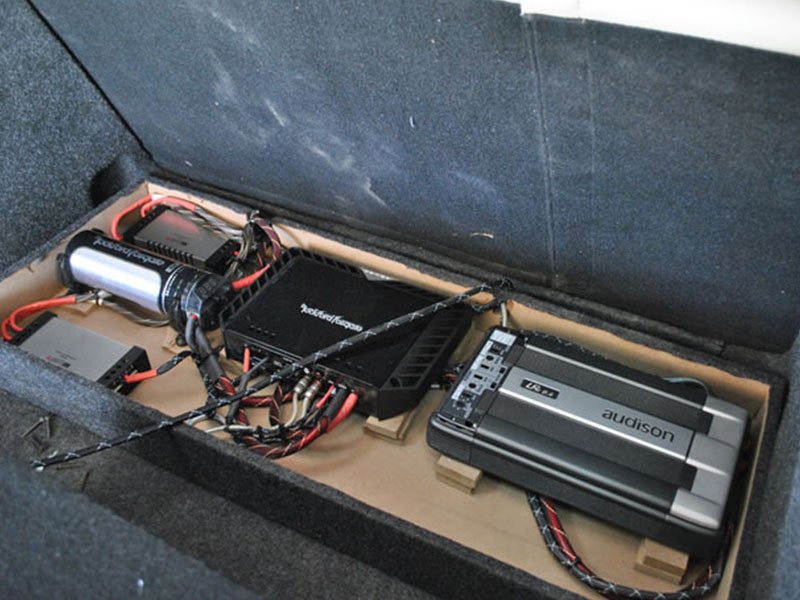 兩臺功放和電容安裝在尾廂的地板上,并固定在木箱里加以保護