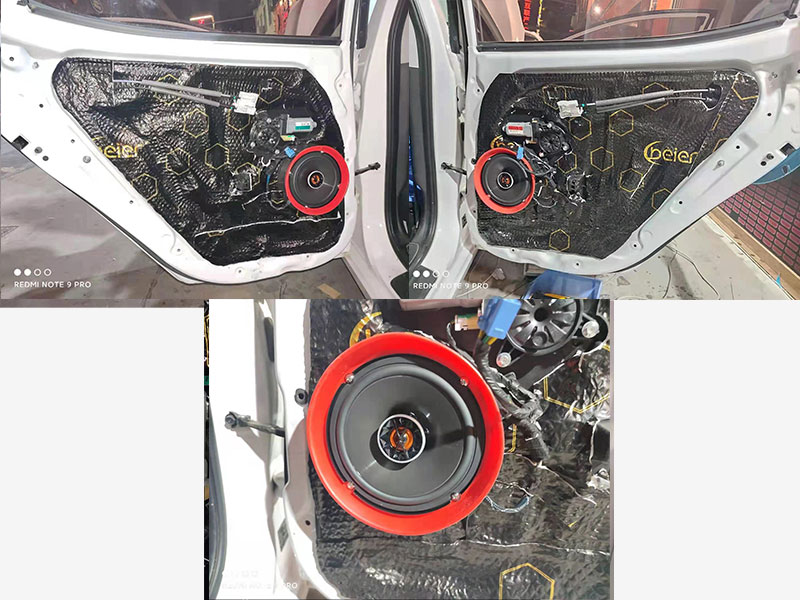 我們依舊是升級(jí)了四門隔音先,車主選用了厚度更厚的貝爾黑膜。第一層隔音操作師傅漏拍圖片了。這里直接給你們看一下第二層隔音的完成效果圖,在此之前喇叭還有焊線,接線,套防水罩等系列操作。你們可以看一下安裝完成后的效果。真正意義上的無(wú)損安裝!